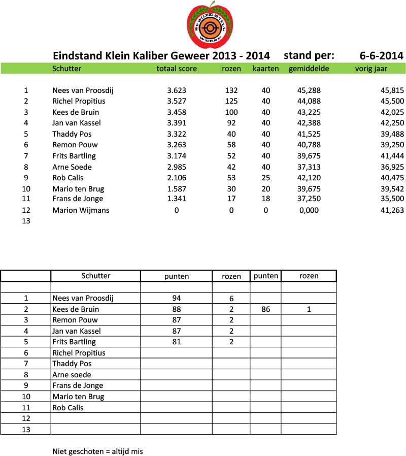 Eindstand Klein Kaliber Geweer 2013-2014